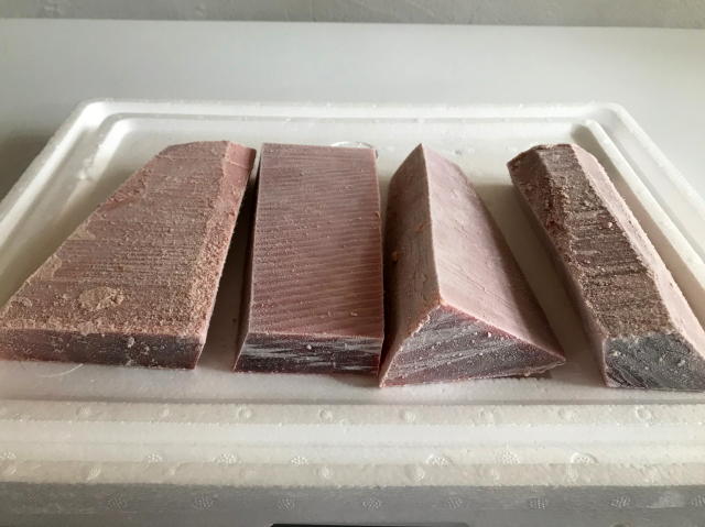 弊社のまぐろは延縄で漁獲された際に生きている魚を中心に揃えてます。よって魚に死後硬直が起こる前に冷凍されることとなります。